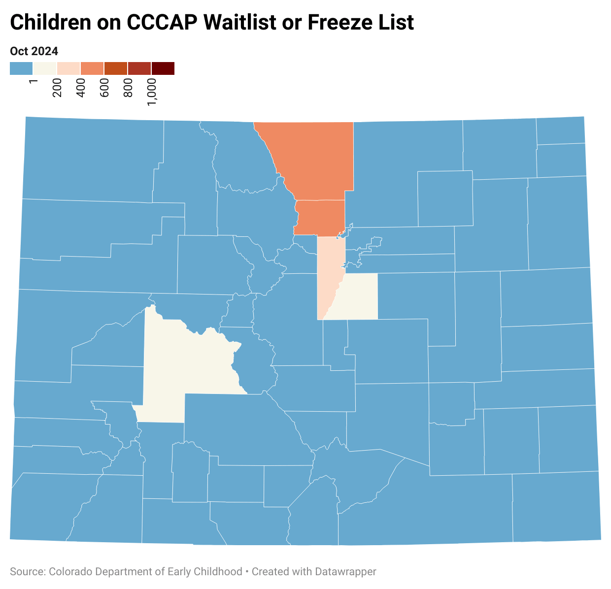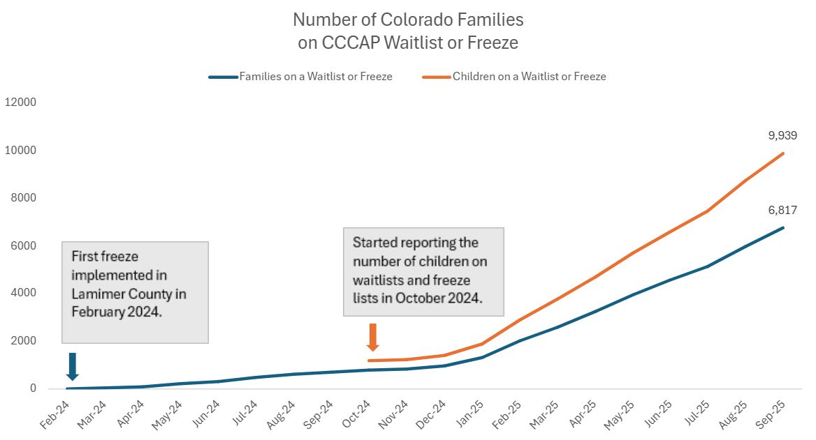 The Colorado Child Care Assistance Program (CCCAP) provides financial help to eligible families. As of September 2025, several counties have implemented a CCCAP waitlist or freeze reducing access for 6,817 families and 9,939 children.